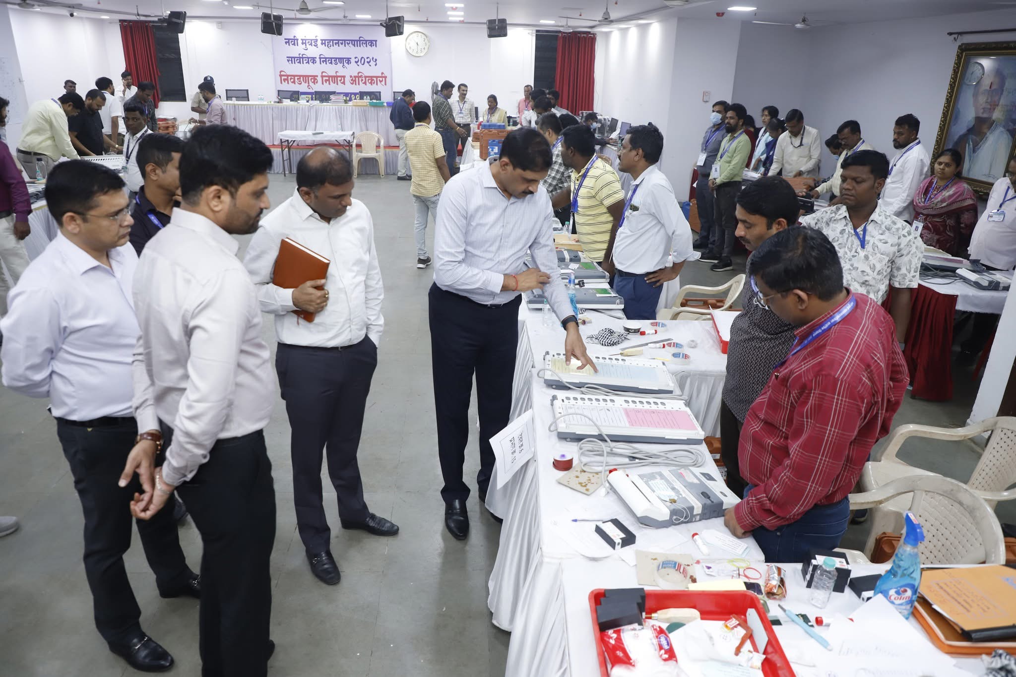 नवी मुंबई महानगरपालिका निवडणूकीकरिता नुकत्याच रायगड जिल्ह्यात झालेल्या नगरपरिषद निवडणूकीसाठी वापरलेली 3500 हून अधिक निवडणूक यंत्रे महानगरपालिकेने 13 ठिकाणांहून ताब्यात घेतली असून त्याची प्रथमस्तरीय तपासणी पूर्ण झालेली आहे. मध्यप्रदेशातून आणलेल्या या ईव्हीएम मशीन पोलीस बंदोबस्तात व वाहनांना जीपीएस ट्रॅकर लावून सुरक्षितपणे नवी मुंबईत आणल्यानंतर या ईव्हीएम मशीनची प्रथम स्तरीय तपासणी बेलापूर येथील वारकरी भवन या ठिकाणी ईव्हीएम मशीन कार्यवाहीचे नियंत्रण अधिकारी उपआयुक्त डॉ. कैलास गायकवाड आणि समन्वय अधिकारी कार्यकारी अभियंता विद्युत श्री. प्रविण गाडे यांच्या नियंत्रणाखाली 35 निवडणूक मास्टर ट्रेनर्स यांच्या माध्यमातून पूर्ण करण्यात आलेली आहे. सदर प्रथम स्तरीय तपासणी राजकीय पक्ष प्रतिनिधींच्या समक्ष करण्यात आलेली आहे.